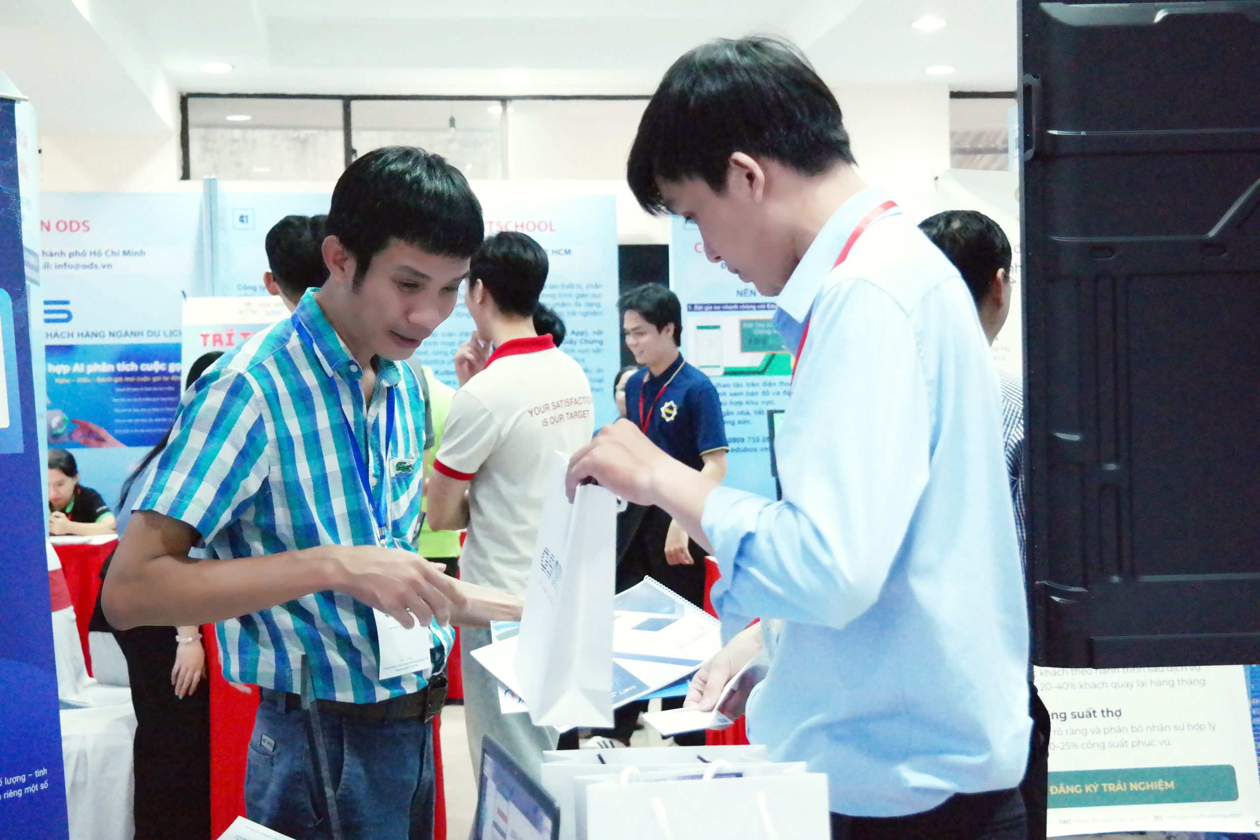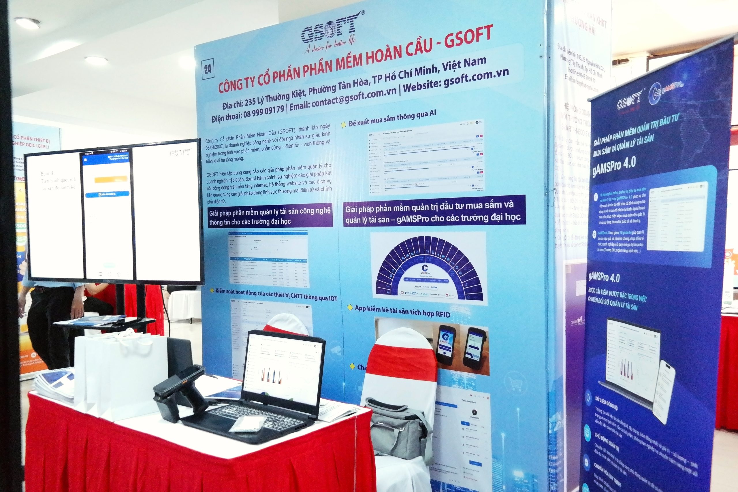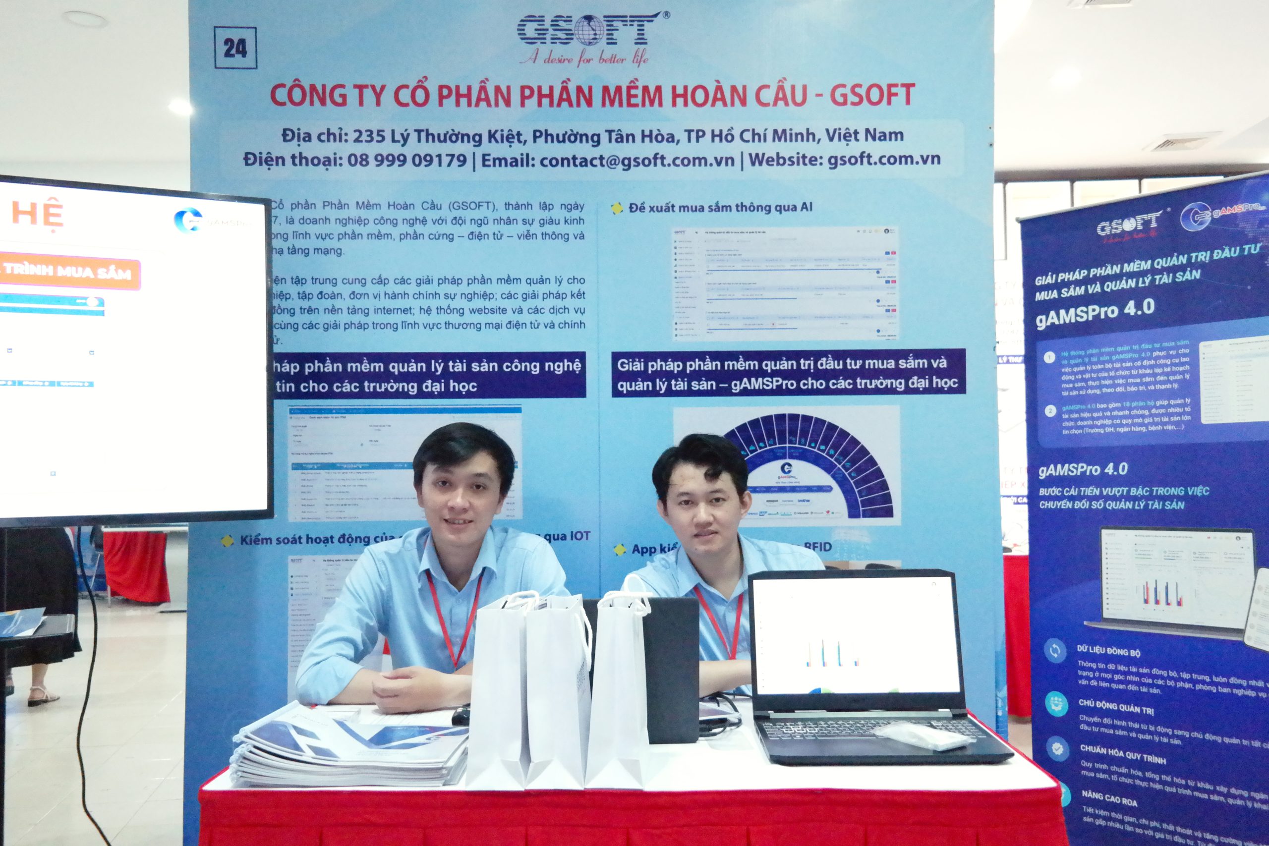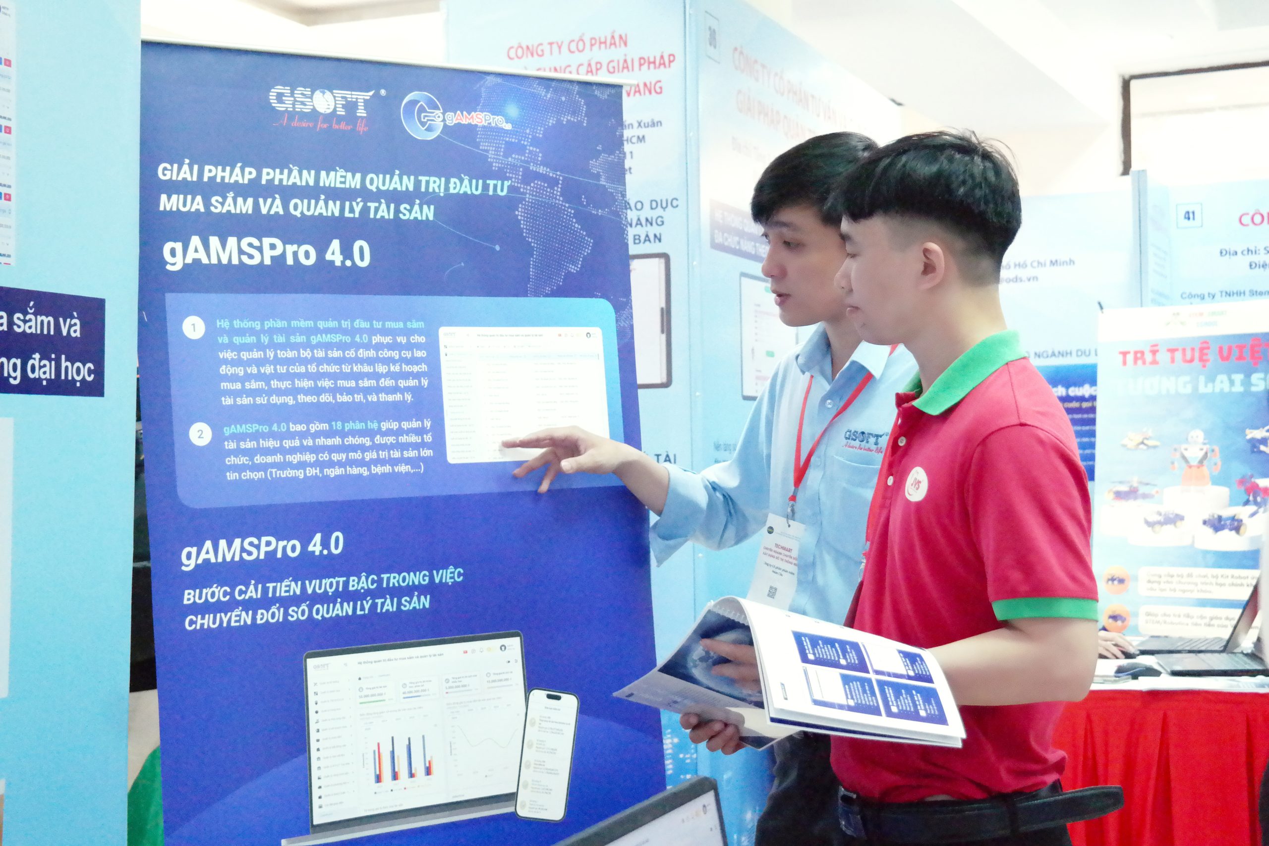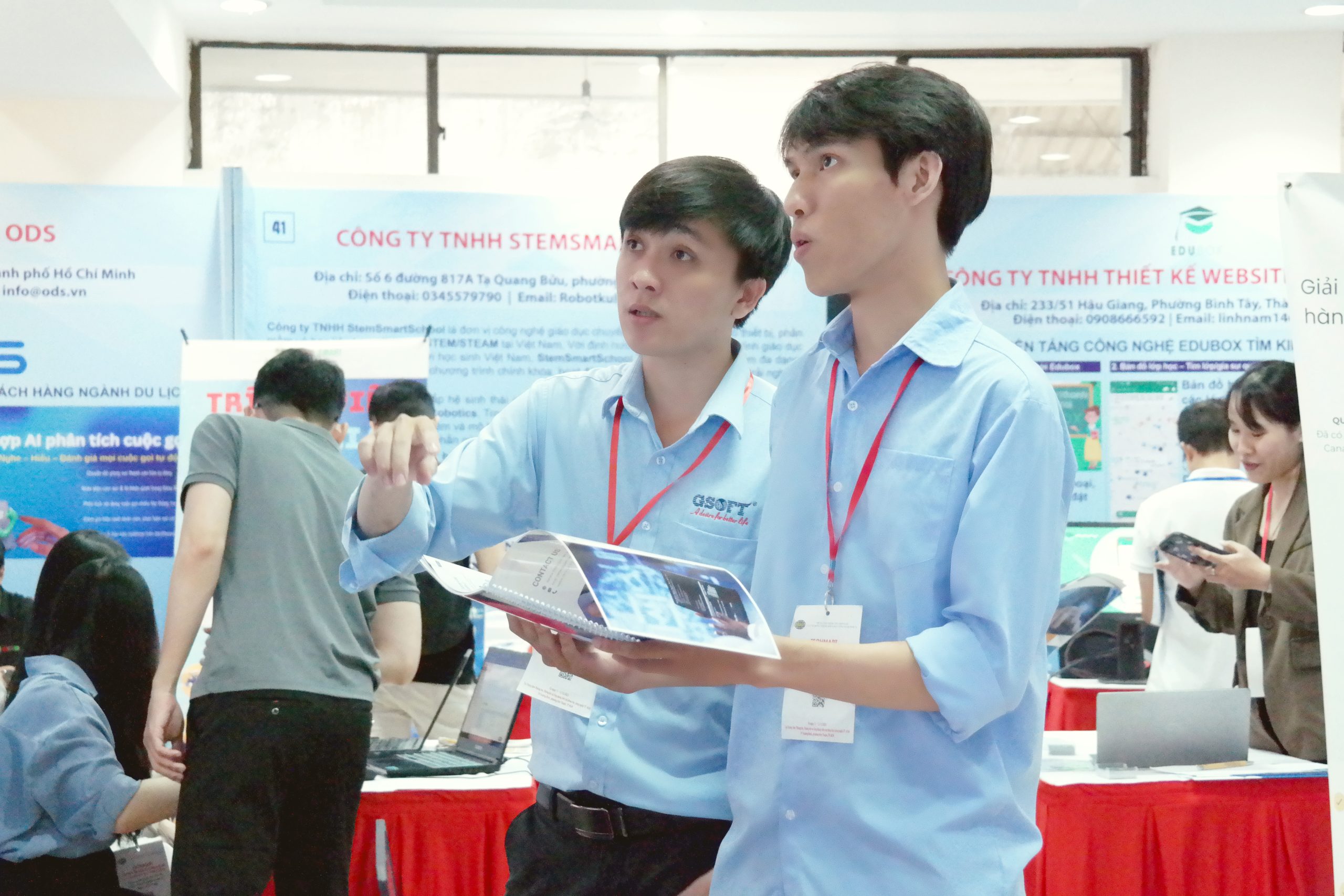 GSOFT vinh dự đồng hành tại sự kiện với gian hàng số 24, nơi Anh Nguyễn Vũ Trường và Anh Huỳnh Văn Thuận trực tiếp giới thiệu giải pháp, chia sẻ trải nghiệm thực tế và tư vấn cho khách tham quan về những công nghệ giúp tối ưu vận hành trong môi trường giáo dục và đô thị.